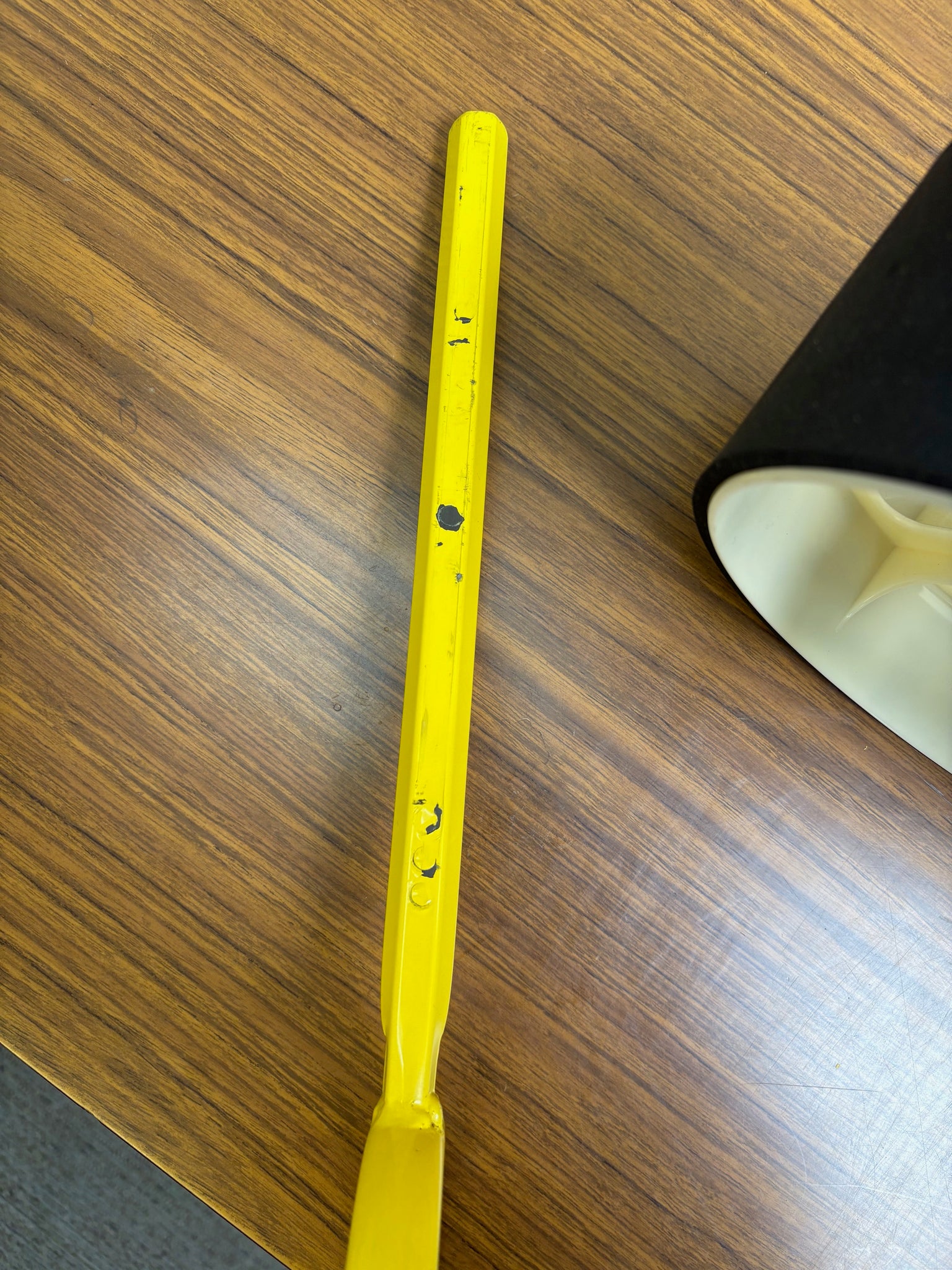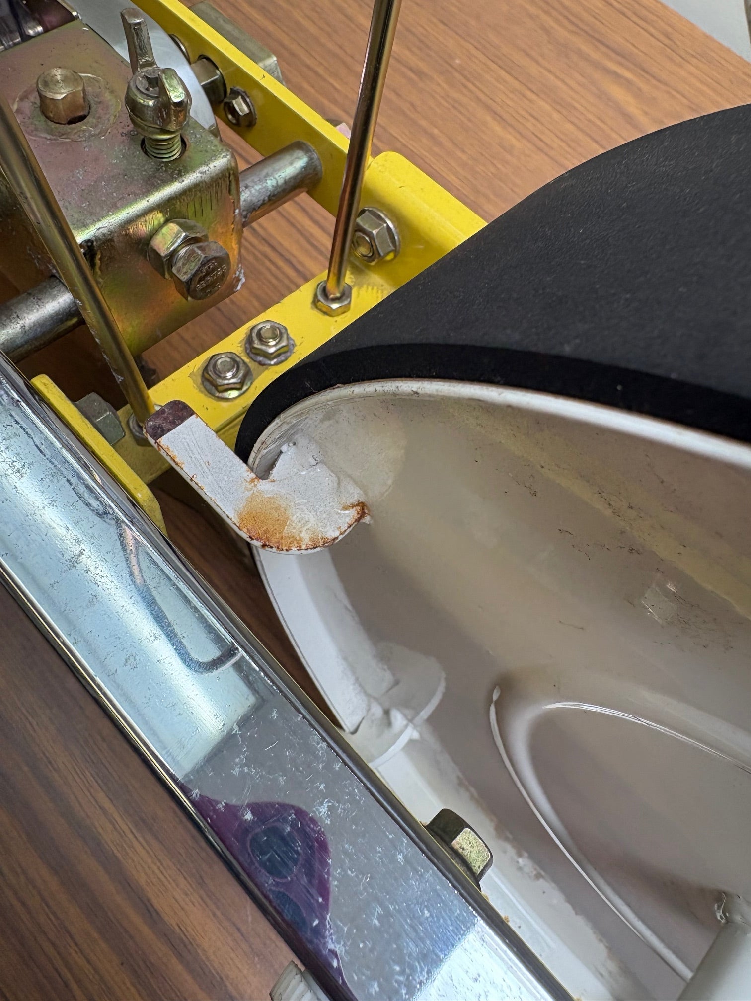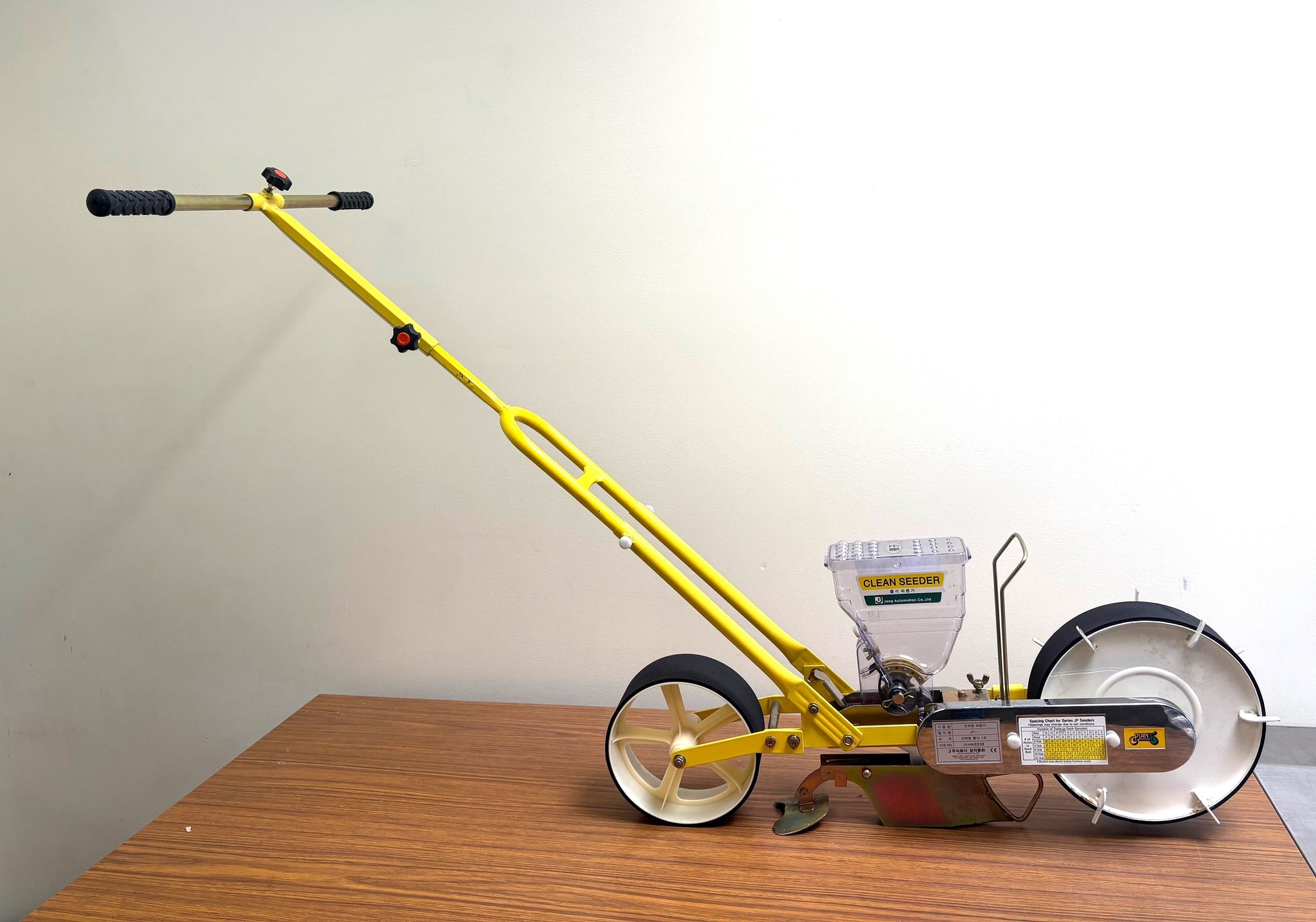Single row push seeder. Older model and has the standard shoe. Never used. It's been sitting in a warehouse for a while so there's a little bit of rust on the front wheel (pictured), paint chipped off on the handlebar, a little damage to the foam on the front wheel (pictured).  Still maneuvers well. Lots of life left!